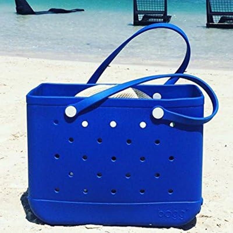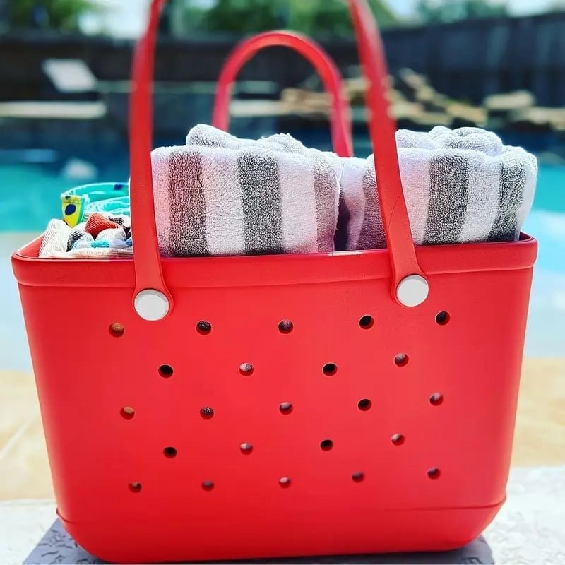 - OVERSIZED CARRY BAG:Large size 48 x 34 x 25 cm. The EVA tote bag is oversized and lightweight, roomy enough to hold tons of towels for snacks, sunscreen, body lotion, flip flops and more. This rubber beach bag can hold all the items you need for any scenario, e.g. For fitness, camping, beach games and swimming.